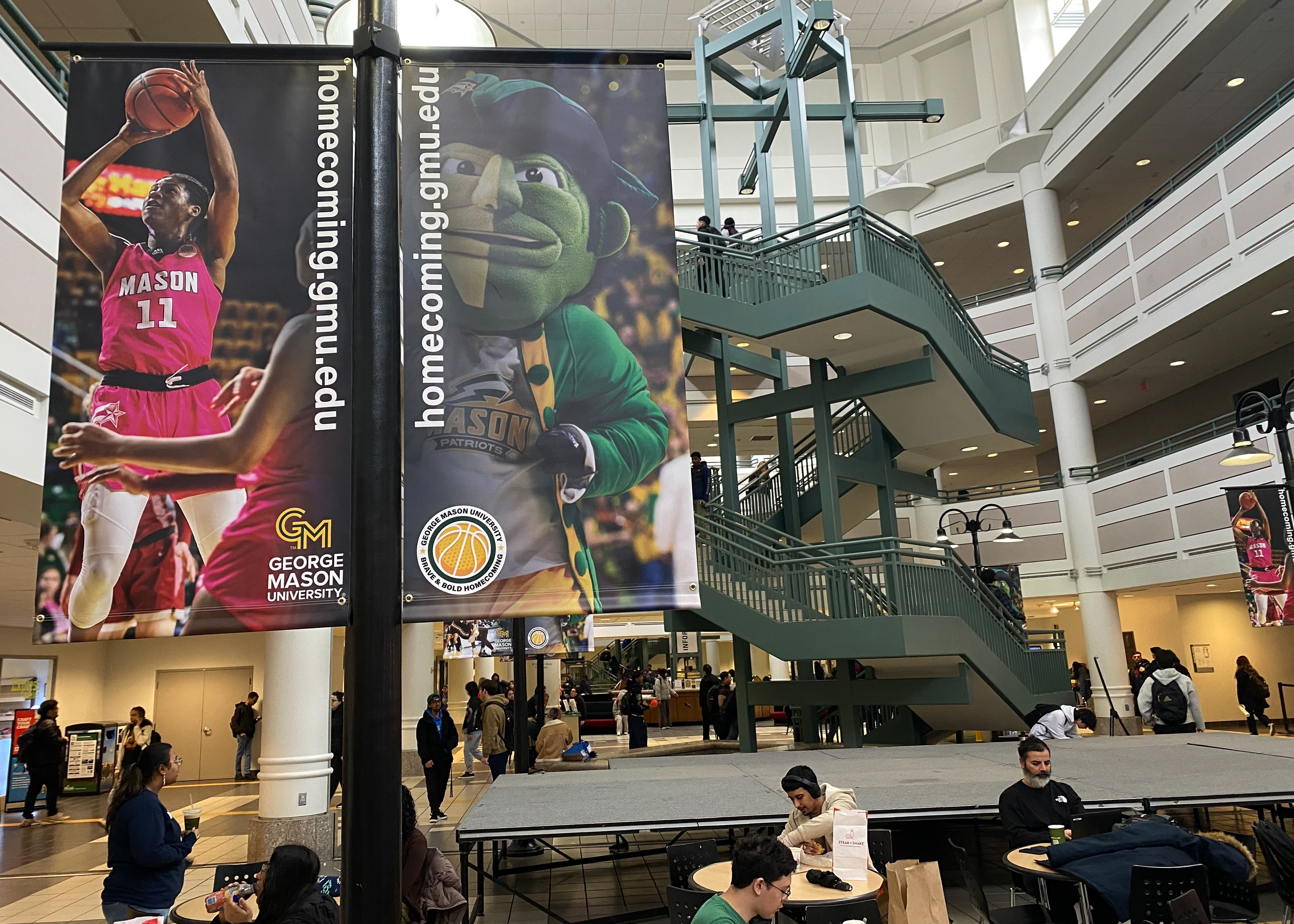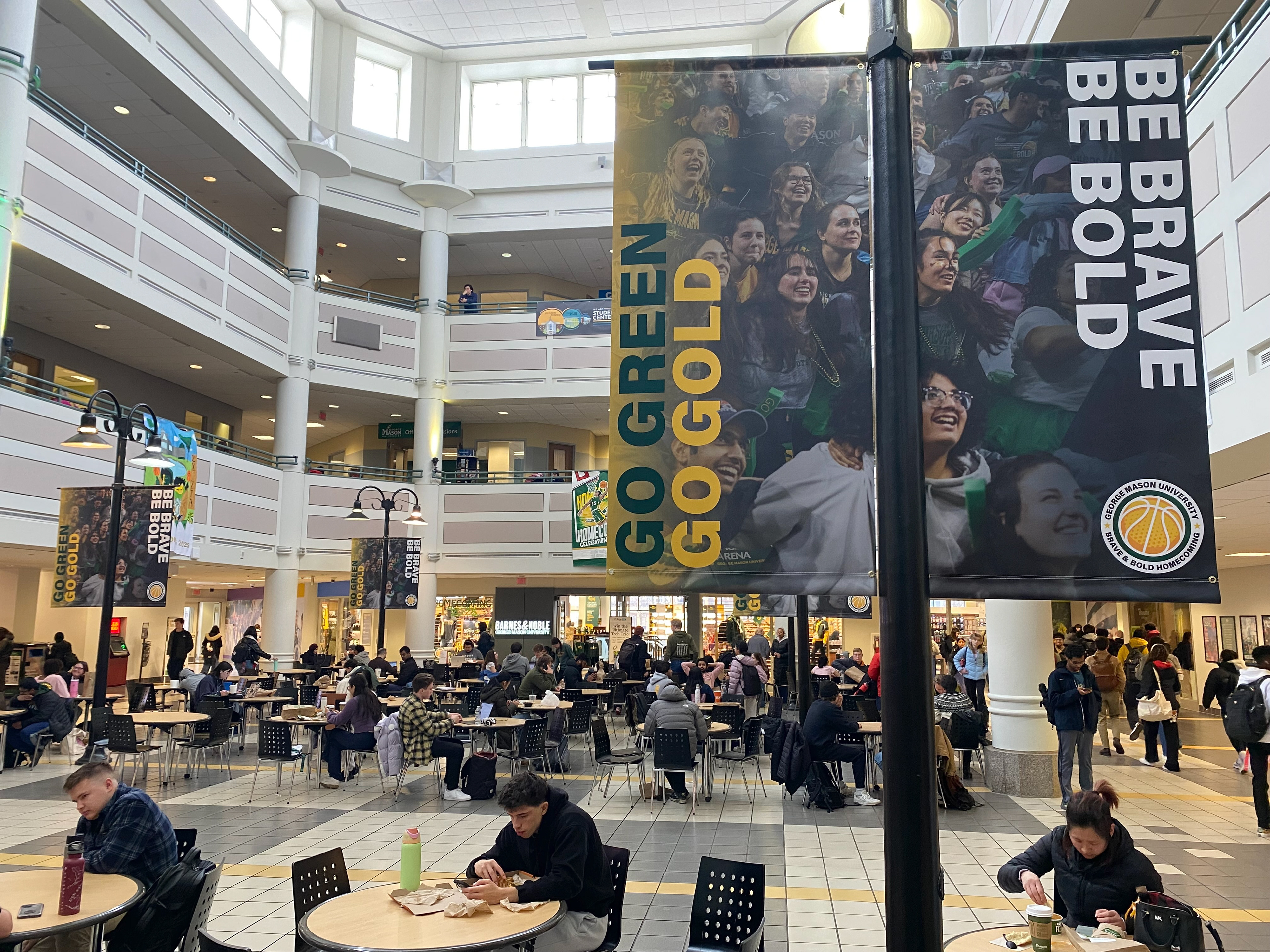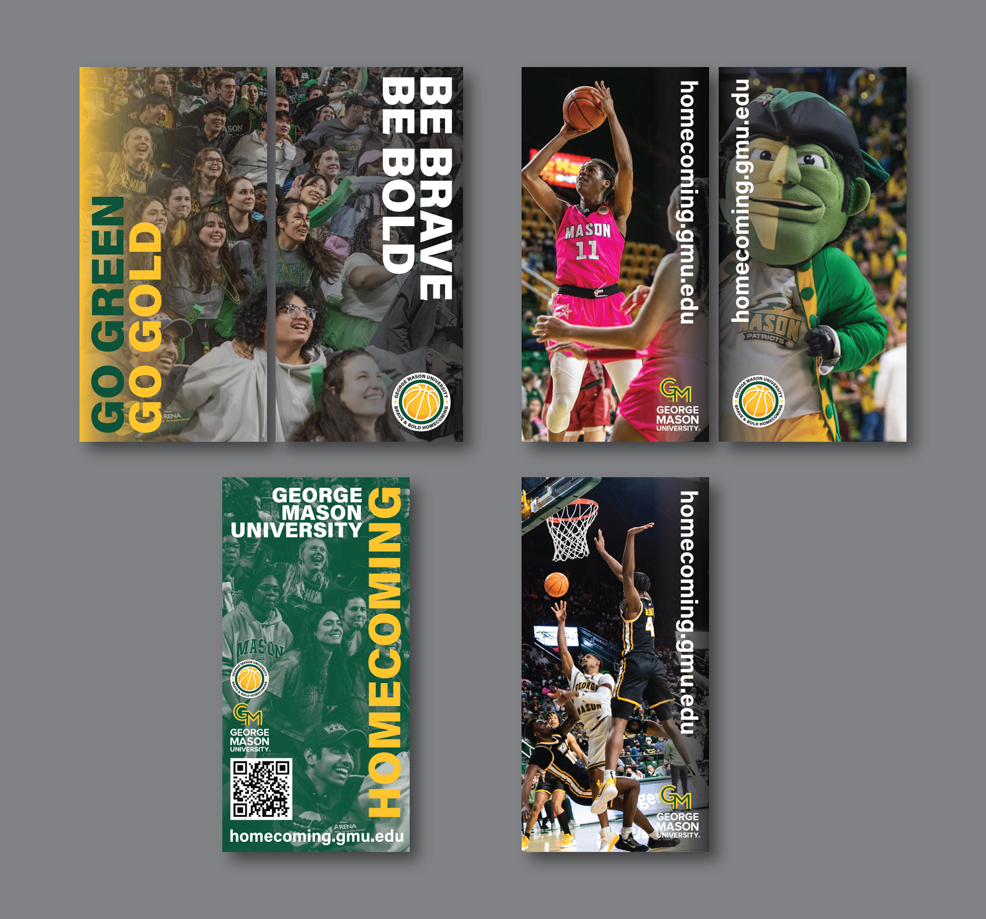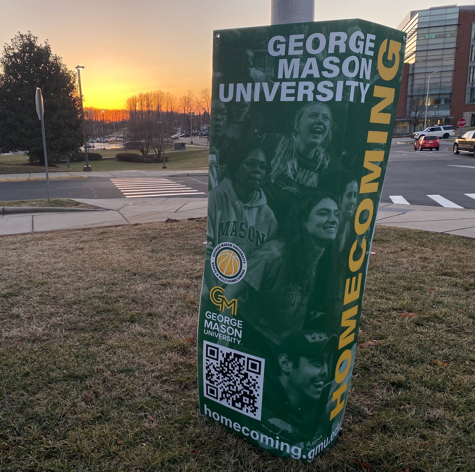Banners from the marketing campaign for George Mason's Homecoming event in Spring 2025. The photos show the banners hanging in the Johnson Center building, as well as other locations around campus.