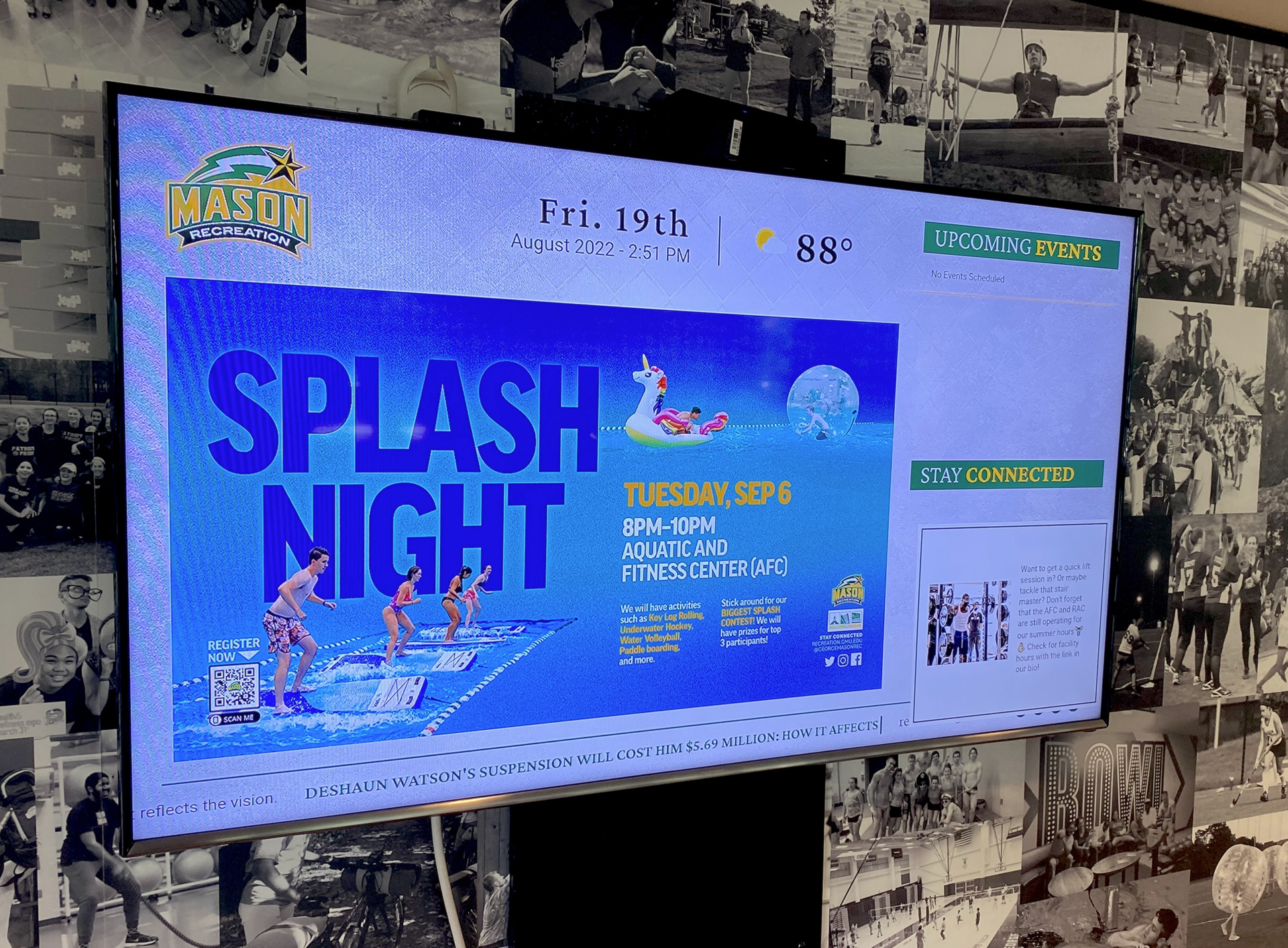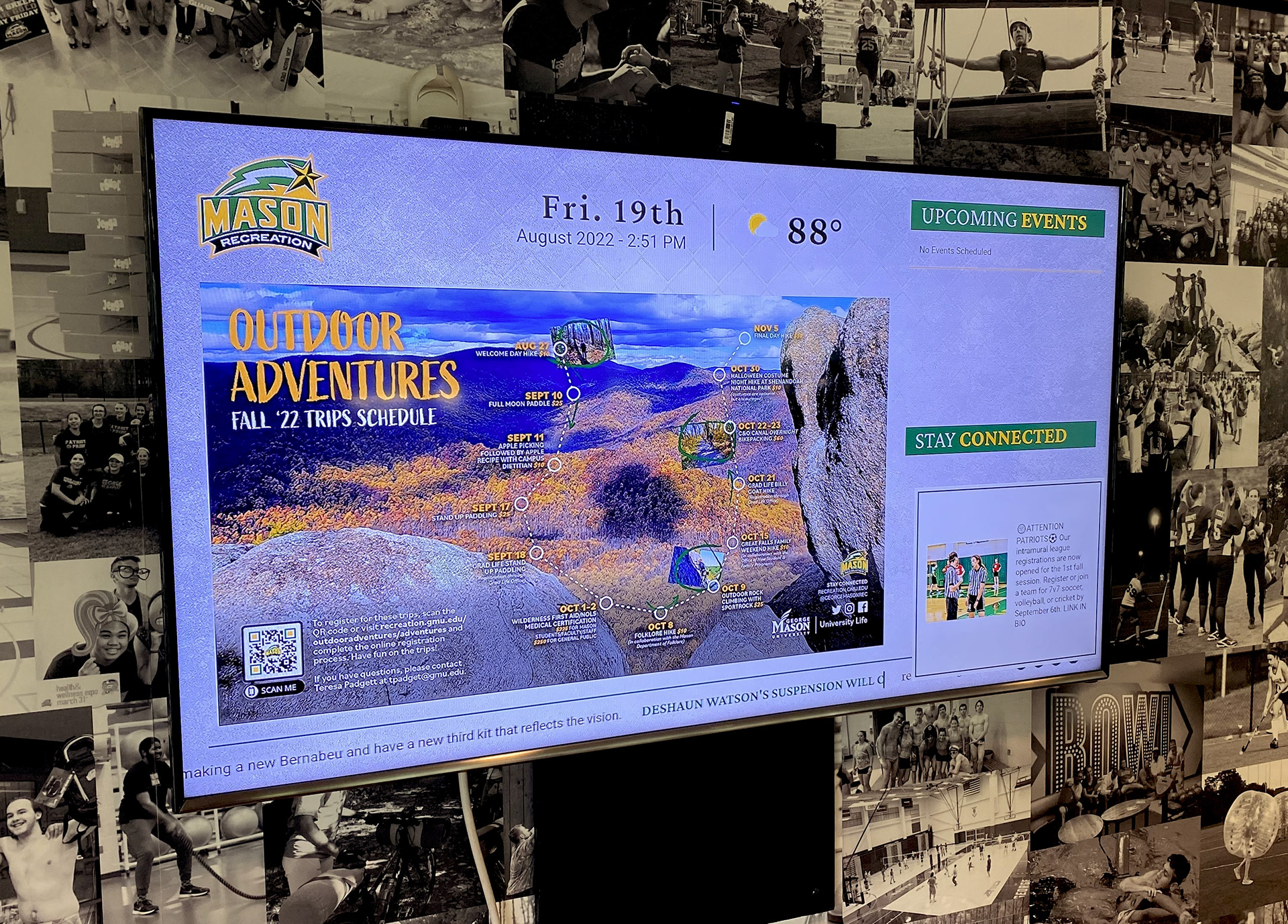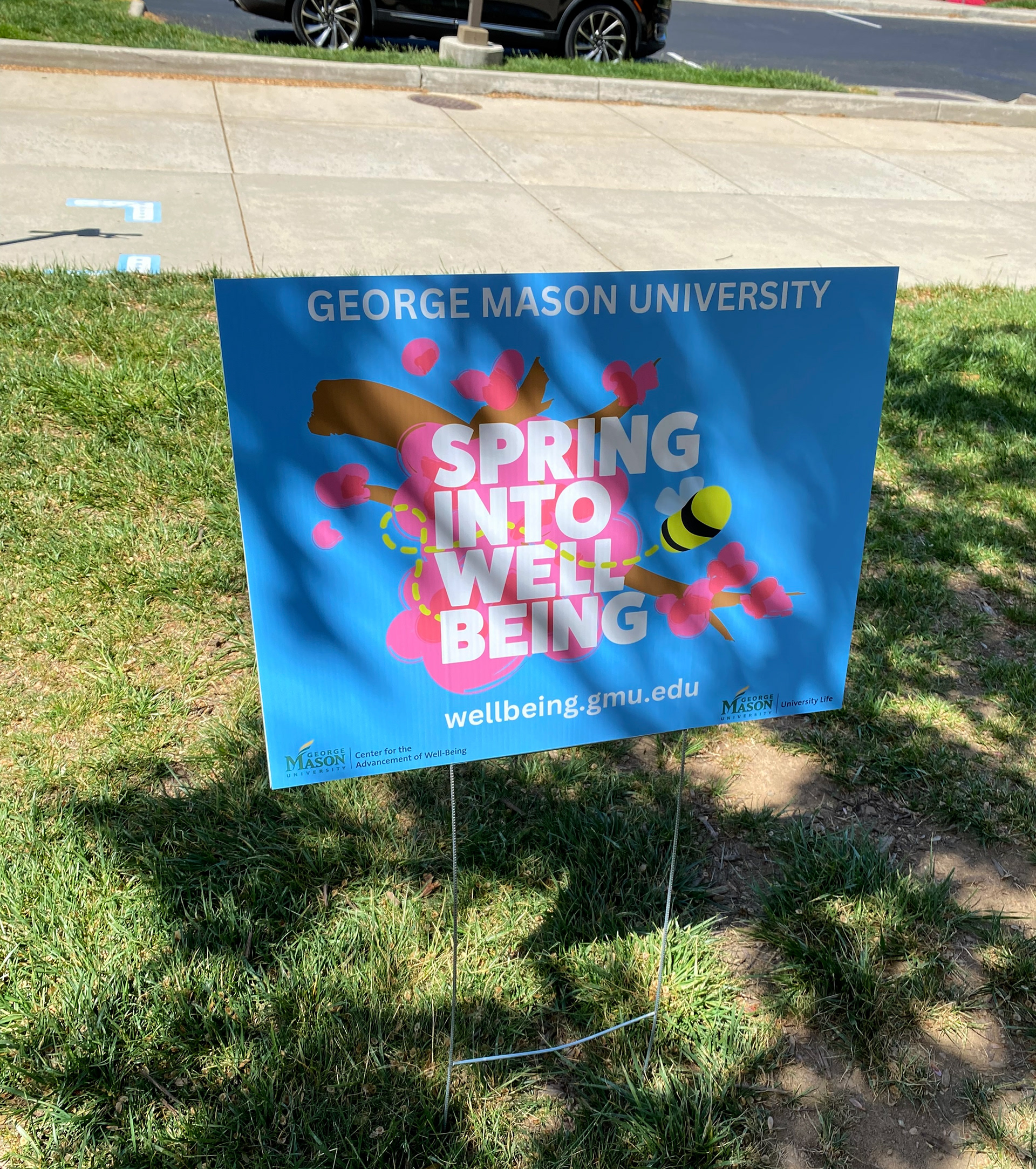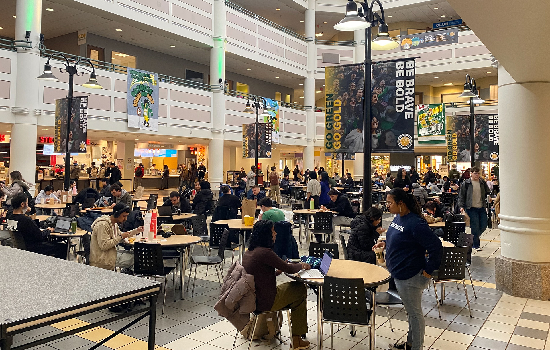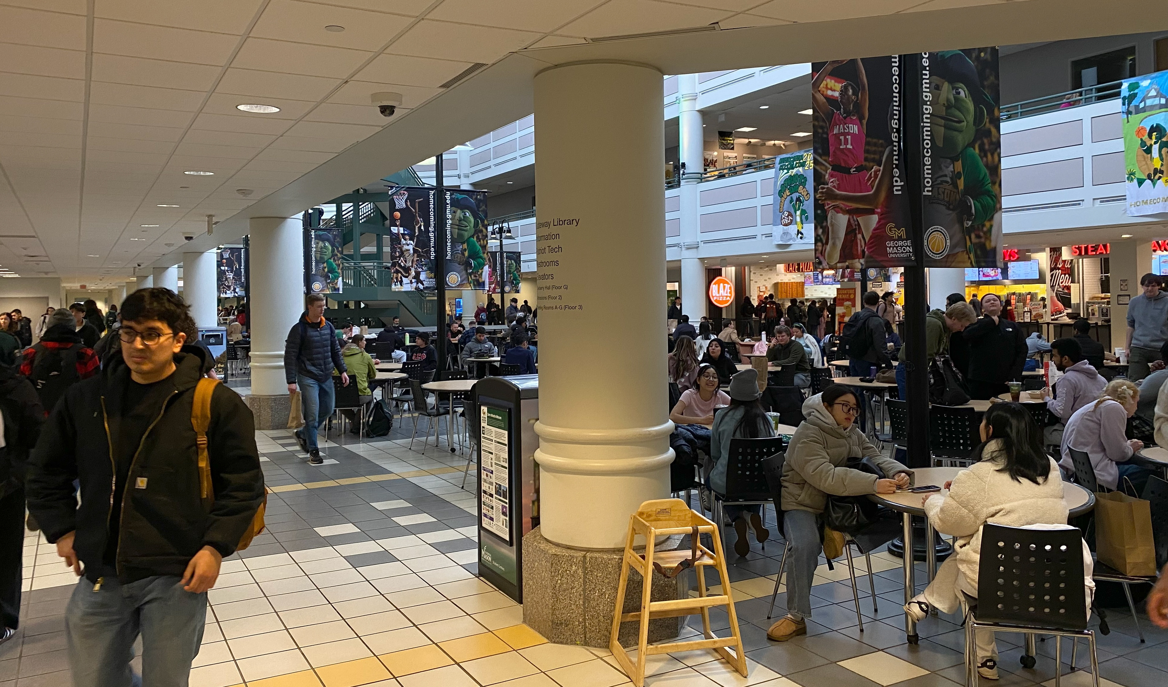 Banners from the marketing campaign for George Mason's Homecoming event in Spring 2025. The photos show the banners hanging in the Johnson Center building, as well as other locations around campus.
